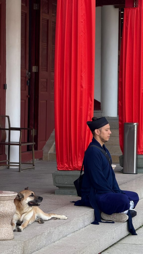 Por tratar de entender la palabra 道 dào, que veía siempre escrita en el libro 黄帝内经huáng dì nèi jīng, vine a china en 2007, buscando maestros, conocí al maestro 黄世真 huáng shì zhēn en 青华宫 qīng huá gōng, 西安 xī’ān y me convertí al Daoísmo, cambié mi religión, adopté una nueva vestimenta y decidí probar durante 10 años este camino. Me resultó un proceso complicado, por la lengua, las costumbres, la alimentación, los cambios radicales de un mundo creciente, pero cada vez que avanzaba en mi experimento encontraba momentos muy placenteros, maestros, hermanos, lugares extraordinarios. Casi han pasado dos décadas de este camino como sacerdote, como practicante asiduo de la filosofía daoísta, mi nombre cambió varias veces, mi último nombre es 得道子, mi vida cambió, hoy en día, reconozco la práctica del 道 dào 修道 xiū dào como una herramienta fundamental para la humanidad, una filosofía que conduce a un verdadero cambio del ser. Por lo mismo, puedo decir que encontrar 道 dào es entendimiento de la naturaleza, comprensión de nuestro ser, reubicación de los valores de la humanidad.