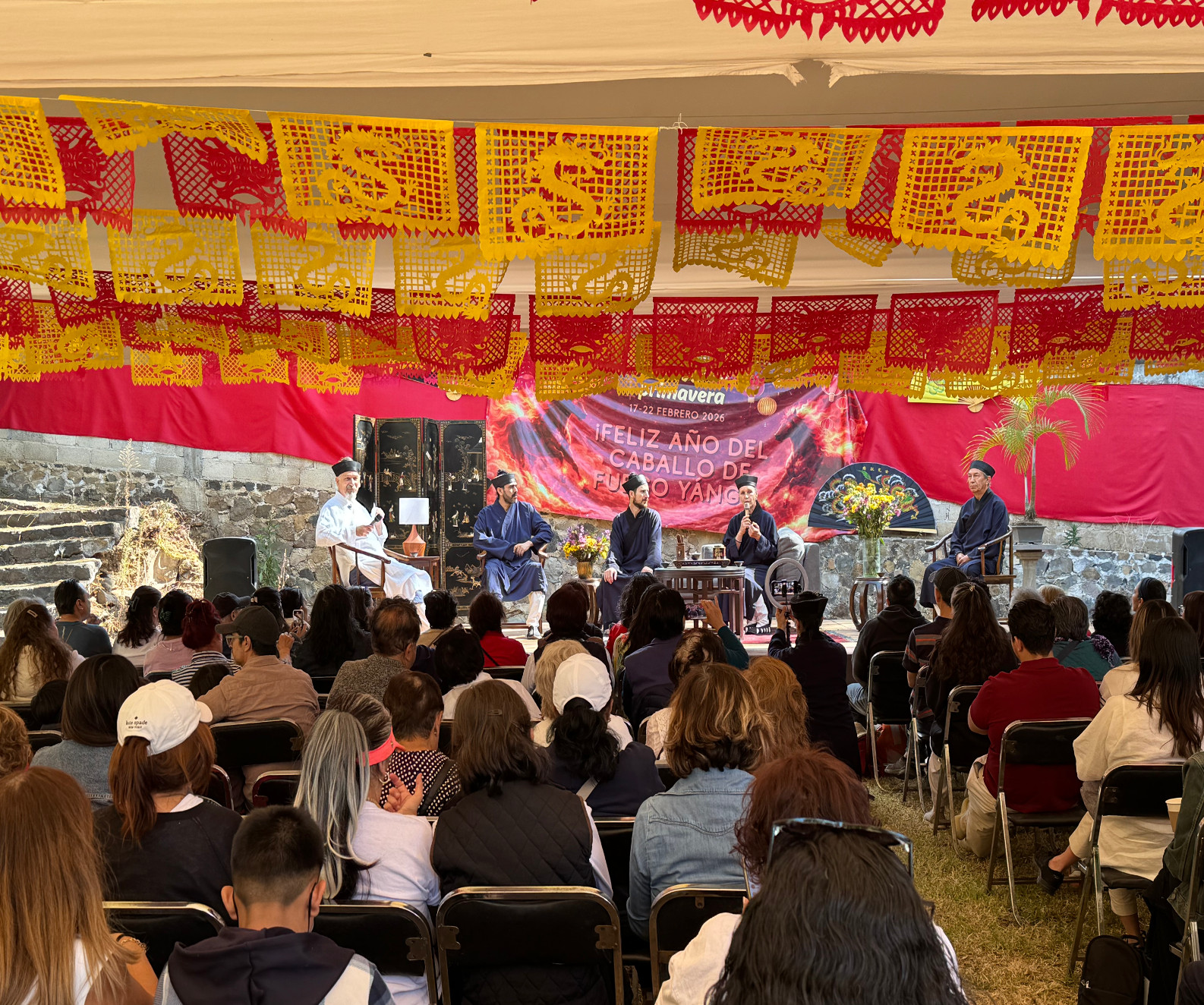 To conclude our festival’s schedule, Master and Abbot 邱景威方丈 qiū jǐng wēi fāng zhang:  Hervé Louchouarn gave a very engaging talk, full of joy and humor, explaining the predictions for this 阳yáng fire horse year, and offering advice on preventing and treating illnesses such as anxiety, stress, and an epidemic like measles. He recommended an important tool that will be fundamental for this turbulent year: breath work. He then led a meditation, seeking to provide those present with a moment of tranquility. He closed by answering a few questions and wishing many blessings upon everyone. The 丙午  bǐng wǔ yáng fire horse year has just begun. Its first heartbeat has already been heard, and the Temple of Eternal Spring continues to blossom.